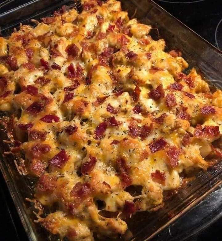 Take baking dish out of the oven and top with shredded cheese, bacon and green onion.