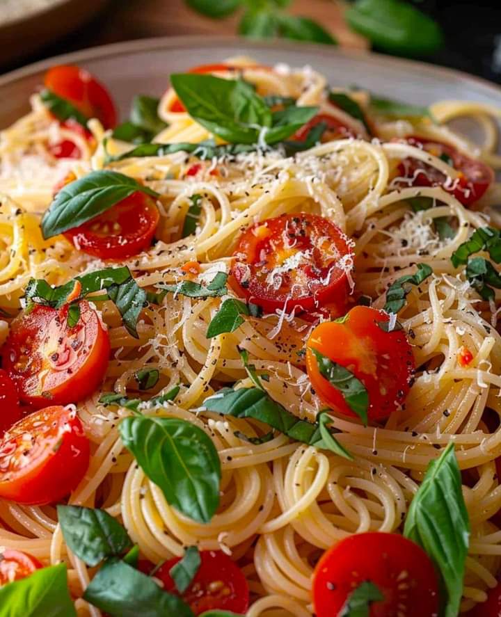 This pasta salad combines the freshness of cherry tomatoes and basil with the bite of red pepper flakes and the richness of Parmesan cheese, creating a vibrant and flavorful dish perfect for any occasion.