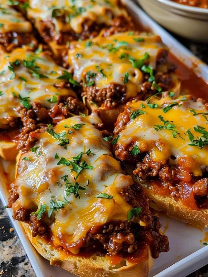 Spoon the meat sauce on top of the garlic toast, then top with mozzarella cheese. Serve hot.