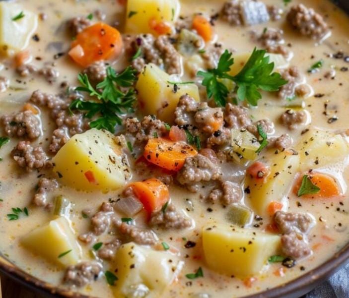 Enjoy this comforting and creamy Crockpot Potato & Hamburger Soup!