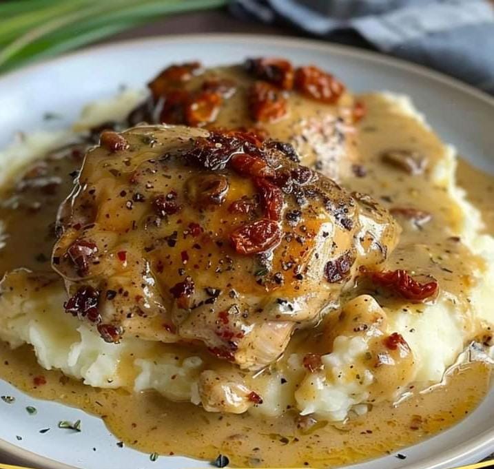 Season & pansear Chicken thighs on both sides w/olive oil in skillet. Transfer to separate Pan. In same skillet start your sauce. Add butter & garlic, cook for about 3 mins. Add chicken broth, sun dried tomatoes and whipping cream. Add seasoning and allow to simmer. Add your cheese while constantly stirring. Pour sauce over chicken and bake in oven for 30-35min on 400 degrees. Serve over Mashed Potatoes