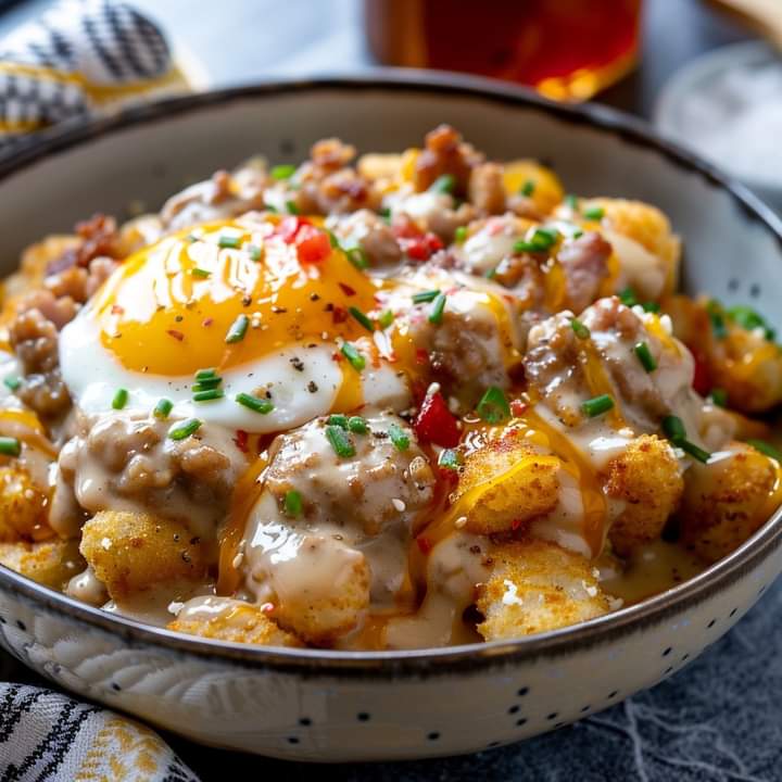 To assemble the bowls, divide the tater tots among serving bowls. Ladle the sausage gravy over the tater tots. Sprinkle with shredded cheddar cheese, chopped green onions, and parsley.