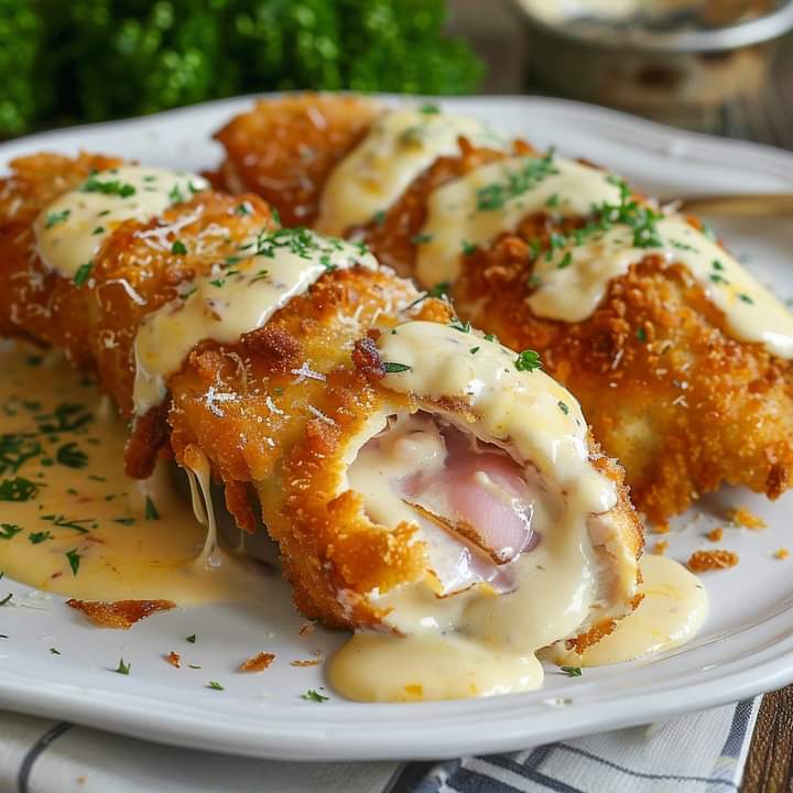 Place the breaded chicken cordon bleu in the oil and cook for about 5 minutes per side, or until the outside is an even golden brown. If a good color is achieved and the chicken’s center is still not 165°F (75°C), place the chicken cordon bleu on a wire rack set over a baking sheet an