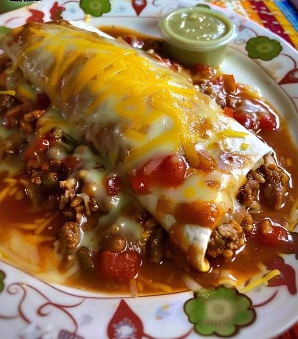 • Bake: Pour half the enchilada sauce into an 8×8″ baking dish. Place burritos seam-side down, cover with remaining sauce, and bake for 10 minutes.