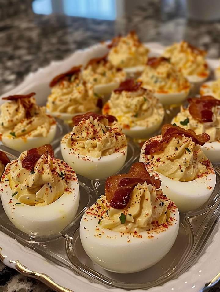 Sprinkle the crumbled bacon on top of the filled egg halves.