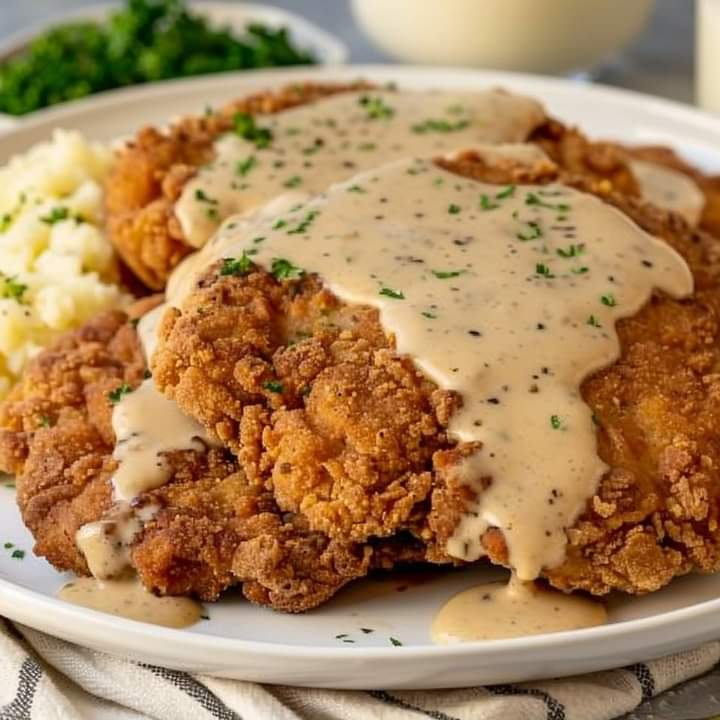 8. Serve the chicken fried steaks topped with the creamy gravy.